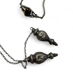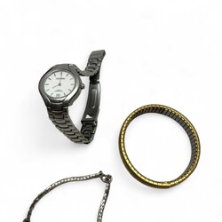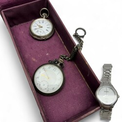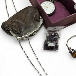 | Omschrijving | Lot bijouterieën, waaronder: tweede gehalte zilveren armband met tijgeroog, en tweede gehalte zilveren breidoppen, en twee zakhorloges in 3e gehalte zilveren kast |