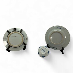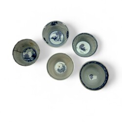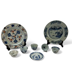 | Omschrijving | Lot Chinees porselein: vijf kopjes, schoteltje met opgehoogde rand in de ziel, Imari bord met bloemdecor, en blauw-wit bord met landschapsdecor, alle 18e/19e eeuw |