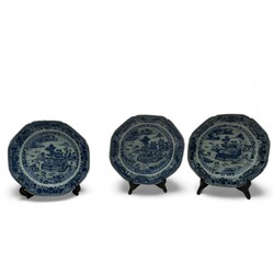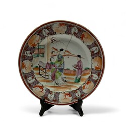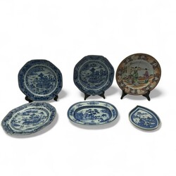 | Omschrijving | Lot Chinees porselein: een 18e of vroeg 19e eeuws druppelvormig schaaltje met landschapsdecor, een ovaal schoteltje met landschapsdecor, drie 18e eeuwse achtkantige borden met landschapsdecor, Qianlong periode (1735-1796), en een 18e eeuws Famille Rose bord met voorstelling van diverse figuren op een terras. |