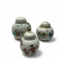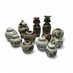 | Omschrijving | Lot divers Famille Rose en nanking porselein: zes Famille Rose gemberpotjes met diverse decors, o.a. van kinderen, bloemen en dieren. Allen gemerkt aan de onderzijde, vier met deksel. Met daarbij drie nanking gemberpotjes, twee vazen en een dekselpot. |