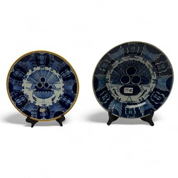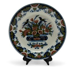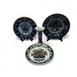 | Omschrijving | Lot divers aardewerk: een 20e eeuwse blauw-wit gedecoreerde aardewerken vaas, met twee metalen ornamenten. Aan de onderzijde gemerkt. Met daarbij een polychrome Tichelaar schotel en twee pauwenborden. |