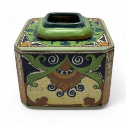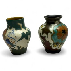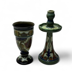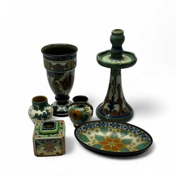 | Omschrijving | Lot divers plateel: een kandelaar, gemerkt 'Rhodian Holland', een vaas, gemerkt 'Aroe Arnhem Holland', schaaltje, gemerkt Zuid-Holland, een inkstel, Ivora Gouda, en twee vaasjes, één Zuid-Holland en één Arnhem Holland. |