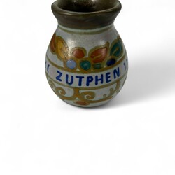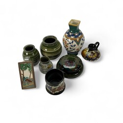 | Omschrijving | Lot divers plateel: twee aardewerken vaasjes, ontwerp Joke Stroes voor Mobach, sigaren bekertje Arnhem, vaasje met vierkante hals, gemerkt Arnhem, decor Ispahan, cloisonné tegel Westraven, dekseldoosje, gemerkt Arnhem, een vaasje met opschrift ‘Zutphen’, door Potterie Rembrandt, en een oorvaas, gemerkt Arnhem. |