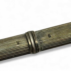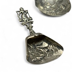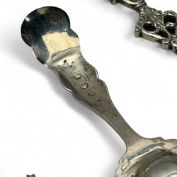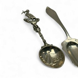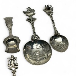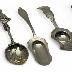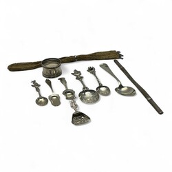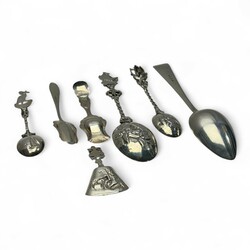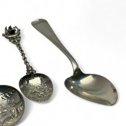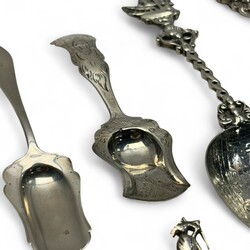 | Omschrijving | Lot divers zilver, waaronder een antieke 19e eeuwse tweede gehalte (835/1000) zilveren breinaaldenkoker met geribd decor, servetring, twee suikerschepjes, Haags Lof lepel, van Kempen, diverse sierlepels. Met daarbij een gebreid beursje met verzilverde ornamentiek. |