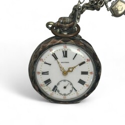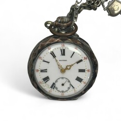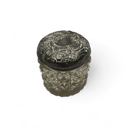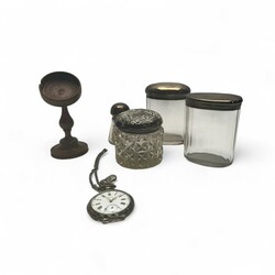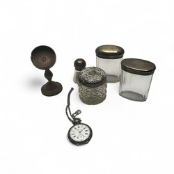 | Omschrijving | Lot divers zilver: een antieke 19e eeuwse Bijbel, joh. Enschede & Zn, 1870, met tweede gehalte (835/1000) zilveren slot, vier kristallen potjes met eerste gehalte (925/1000) Engels zilveren monturen en deksels, en een derde gehalte (800/1000) zilveren zakhorloge aan onedele chatelaine |
