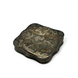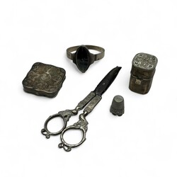 | Omschrijving | Lot divers 19e en 20e eeuws eerste (925/1000) en tweede gehalte (835/1000) zilver: een antiek 19e eeuws pillendoosje, gegraveerd, mr. Cornelis Monteban, Schoonhoven (1843-1880).19e eeuws lodereindoosje, jaren ’60 eerste gehalte (925/1000) dameshorloge, gemerkt Golana, vingerhoedje en een antieke 18e of vroeg 19e eeuwse naaischaar |