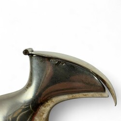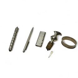 | Omschrijving | Lot divers zilver en verzilverd: een tweede gehalte (835/1000) zilveren servetring, gegraveerd met naam ‘Rutger’. 22,94 gram, een tweede gehalte (835/1000) zilveren schenkkurk, versierd met parelrand. Mr. LJB 3 = Fa. den Leeuw den Bouter, werkzaam te Schoonhoven van 1946 tot 1984. Bruto 31,5 gram, een 20e eeuwse eerste gehalte (925/1000) zilveren balpen, geribd decor. Gemerkt ‘925’. 21,5 gram. En een verzilverde make-up houder en aansteker. |