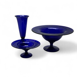 | Omschrijving | Lot diverse glazen objecten, waaronder: twee ‘Bristol blue’ schalen op hoge voet en bokaal, alle drie gemerkt, oranje kom met blauwe rand, gesigneerd Eamonn Vereker (hedendaags), Australië, en donkerrode siervaas met twee slingers, onduidelijk gesigneerd |