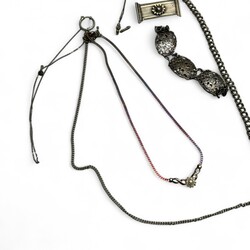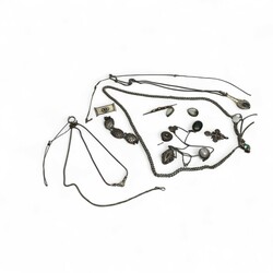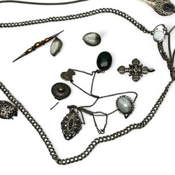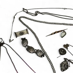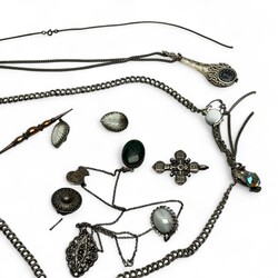 | Omschrijving | Lot met diverse gehalte zilver, vergulde en onedele sieraden. Bestaande uit colliers en broches waarvan één van een antiek boekslot. Een kruishanger en een hanghorloge aan een collier. |
