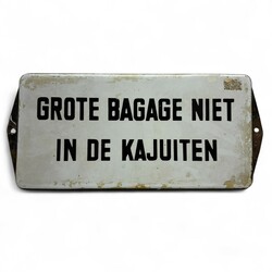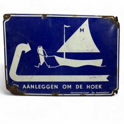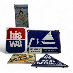 | Omschrijving | Lot diverse reclameborden. Vijf emaille borden, onder andere driehoekig bord ‘ANWB Bondskampeerplaats’ Lancat Bussum, Hiswa reclamebord, emaille bord met zeilschip en tekst ‘Aanleggen om de hoek – Recreatieschap de Marrekrite’, replica emaille bord Zwitsal en klein emaille bord ‘Grote bagage niet in de kajuiten’. Met daarbij een klein blikken bordje ‘Grande Torréfaction de Cafés E. Jacqmotte’. |