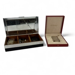 | Omschrijving | Lot divers rookgerei, waaronder een Dupont aansteker in doosje, en een sigarettendoosje met sigarenkniippers |