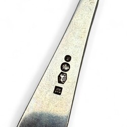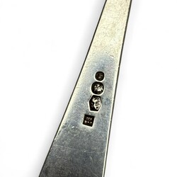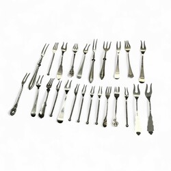 | Omschrijving | Lot van 24 stuks tweede gehalte (835/1000) zilveren diverse vorken waaronder twee onedele vorken aan zilverenheften. Diverse meesters, leeftijden en steelbekroningen. |