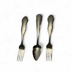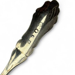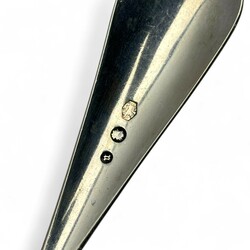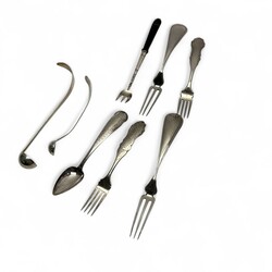 | Omschrijving | Lot van acht stuks vroeg 19e eeuws tweede gehalte (835/1000) zilveren schepwerk. Bestaande uit zuurvorken, mosterdlepeltjes. Waarvan één aan een bewerkt houten heft. Diverse meesters. |