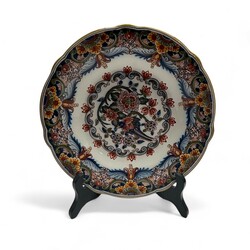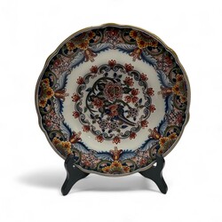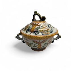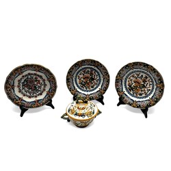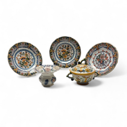 | Omschrijving | Lot van vijf stuks Tichelaar, Makkum aardewerk. Bestaand uit drie schotels, een kwispedoor en een brandewijnkom met dubbele oren en deksel. Alles gemerkt. |