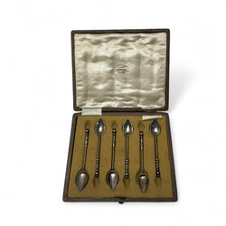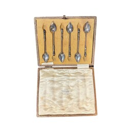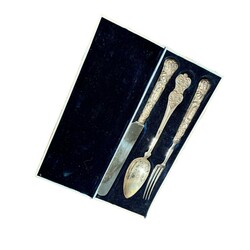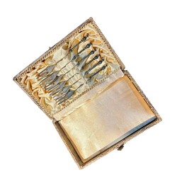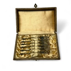 | Omschrijving | Lot zilver: zes tweede gehalte zilveren gebaksvorkjes met gedraaide steel, en zes tweede gehalte zilveren theelepeltjes, beide in cassette, slatang met buitelands zilveren monturen, en vork en mes met zilveren monturen, en Frans zilveren lepel, in rode cassette |