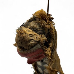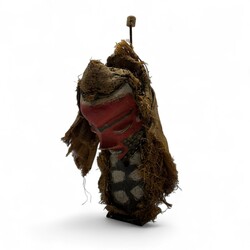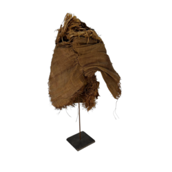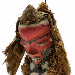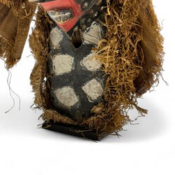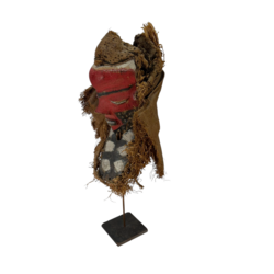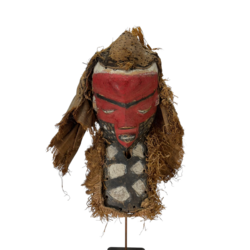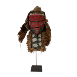 | Omschrijving | Een 20e eeuws Afrikaans uit hout gestoken masker, mbuya, Pende-volk, Democratische Republiek Congo. Versierd met rode, zwarte en witte pigmenten en geometrisch motief op de kin. Op metalen standaard. |
