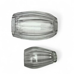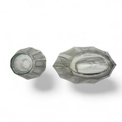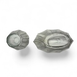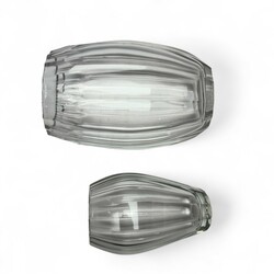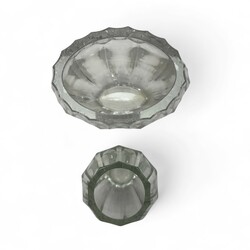 | Omschrijving | Twee blank glazen kantige geslepen vazen, 15 en 21 cm hoog. Beide van Moser, maar 1 gemerkt met etsmerk voor Moser, Karlsbad ca 1930. |