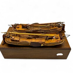 | Omschrijving | Paar scheepsmodellen: skûtsjes, in bijbehorende houten kist, met verfijnde details als zwaardjes, vlaggetjes en water tonnetjes, in originele houten kist |