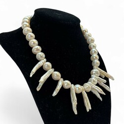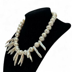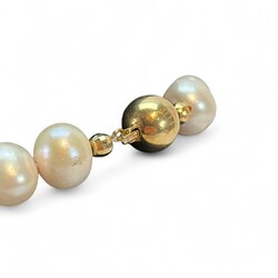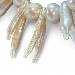 | Omschrijving | Parelcollier met acht takvormige parels, aan 14 karaats gouden bolslot |