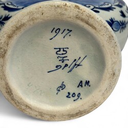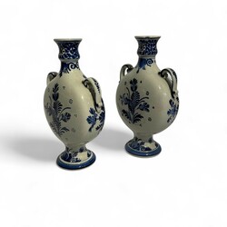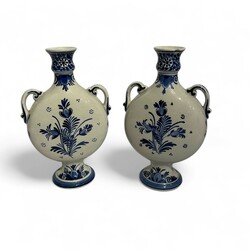 | Omschrijving | Paar Delfts aardewerk platte ronde oorvazen, zogenoemde ‘maanflessen’, met blauw-wit landschapsdecor, staand op ronde voet, uitvoering De Porceleyne Fles, gedateerd 1917 |