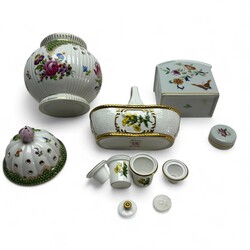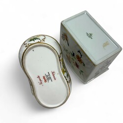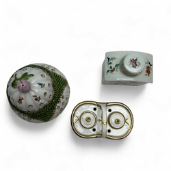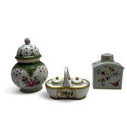 | Omschrijving | Drie porseleinen objecten met bloemdecors en vergulde details, alle 20e-eeuwse replica’s naar antieke voorbeelden: inktstelletje in de vorm van een mandje, gemerkt Spode, England, potpourri vaas, het deksel bekroond door een roos, en theebus, gemerkt Vista Alegre, Portugal |