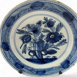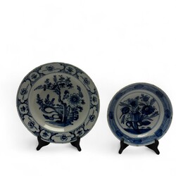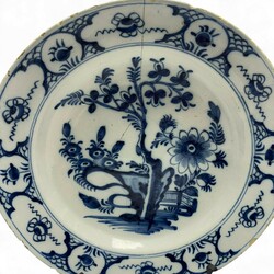 | Omschrijving | Een 18e eeuws Delfts aardewerken schotel, 34,5 cm doorsnede. Blauw/wit met een Chinoiserie decor van een boom, rots en pioenroos. Ca 1780. Scheur. Hierbij nog een 18e eeuwse Delfst aardewerken schotel, 27 cm doorsnede. Blauw/wit met een Chinoiserie decor van een tuin met diverse bloemen. Zgn Boerendelfst, Haarlijn. |