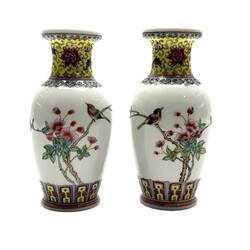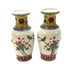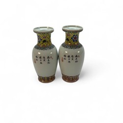 | Omschrijving | Lot van twee 20e eeuwse Chinees porseleinen vaasjes, met emaillebeschildering en decor van bloemen op een tak. Aan de achterzijde met karaktertekens, aan de onderzijde gemerkt met zegelmerk. |