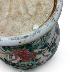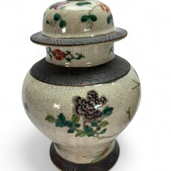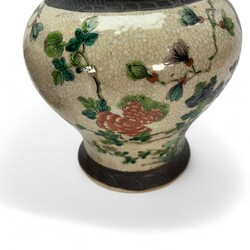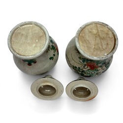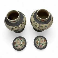 | Omschrijving | Lot van twee 19e eeuwse Chinees porseleinen dekselvazen, nanking ware, met Famille Verte en Rose beschildering van vogel op een rots. Ongemerkt, ca. 1900. |