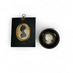 | Omschrijving | Lot van twee portretminiaturen: een Engels 19e eeuws silhouetportret, op de achterzijde tekst ‘Elizabette Thompson – Aged 17 Years’. Met daarbij een 19e eeuwse camee, portret van een vrouw. |