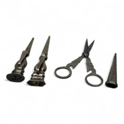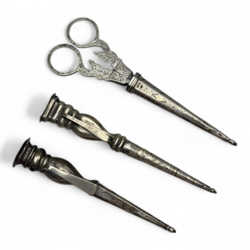 | Omschrijving | Lot naaigerei: twee antieke 19e eeuwse tweede gehalte (835/1000) Nederlands zilveren breipenhouders, gegraveerd modellen. Beide onduidelijk gekeurd, één met stippelgravure ‘T.J.B’. Met daarbij een 19e eeuwse zilveren naaischaar in schede, met meesterteken ‘JS189’ = Jan Schijfsma, Woudsend/Sneek, 1848-1902. |