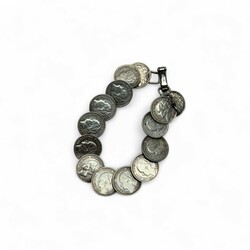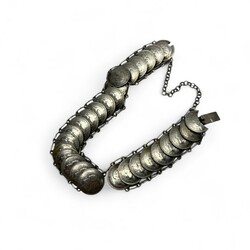 | Conditie | Armband met 14 dubbeltjes: nieuw sluitinkje, niet origineel. Kleine defecten en lichte gebruikssporen |