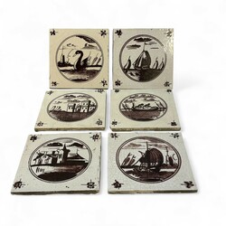 | Omschrijving | Verzameling van circa 35 aardewerk cirkeltegels met mangaanpaarse decors en spinnekophoekmotief, waaronder: zeilbootjes, dorpsgezichten, figuren, en zwaan in de vijver, alle 19e eeuw |