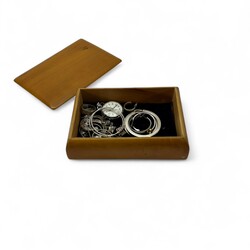 | Omschrijving | Verzameling oorringen en oorstekers, waaronder zilver, daarbij: onedel horloge, alles verzameld in teakhouten kistje |
