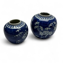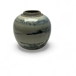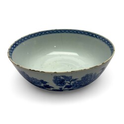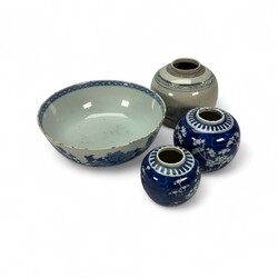 | Omschrijving | Lot van vier stuks Chinees porselein: een grote 18e eeuwse blauw-witte kom, Qianlong periode (1735-1796), een 19e-eeuwse blauw-witte gemberpot en twee 20e-eeuwse powderblue gemberpotjes |