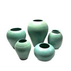 | Omschrijving | Vijf aardewerk vazen, alle met groen/turquoise glazuur, gemerkt en uitvoering Mobach, Utrecht |