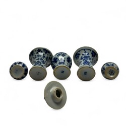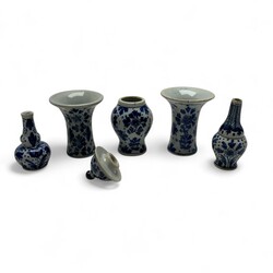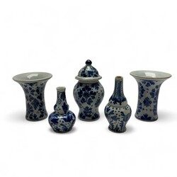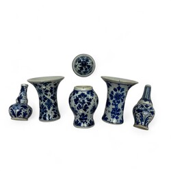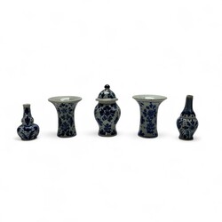 | Omschrijving | Lot van vijf vroeg 20e eeuwse blauw-wit gedecoreerde aardewerken miniatuur vaasjes, waaronder een driedelig kaststel. Allen gemerkt Tichelaar Makkum. |