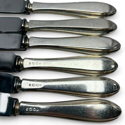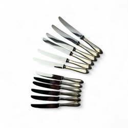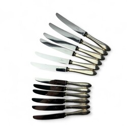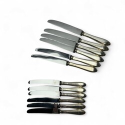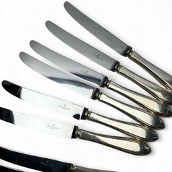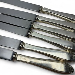 | Omschrijving | Lot 20e eeuwse messen met tweede gehalte (835/1000) zilveren grepen, bestaande uit zes kleine messen (21 cm), zes grote messen (24,5 cm) mr. Van Kempen en begeer, jaarletter N (1973) t/m P (1975) |