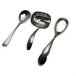 | Omschrijving | Zilveren eierlepel, meesterteken Adrianus Kuijlenburg, Schoonhoven, jaarletter 1880, groentelepel, meester J.M. van Kempen & Zonen, Voorschoten, jaarletter 1920, en tweede gehalte zilveren strooilepel |