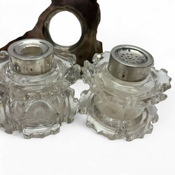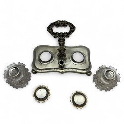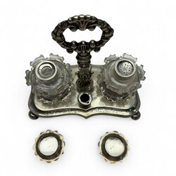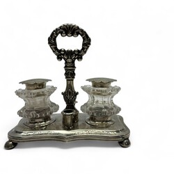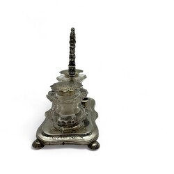 | Omschrijving | Een antiek 19e eeuws inktstel, tweede gehalte (835/1000) gecontourneerd en gegraveerd basement met hengsel, op bolpootjes. Geslepen kristallen inkt- en zandpotje, met zilveren montuur en deksel. Gekeurd met lopende leeuw, onduidelijk meesterteken en Jaarletter O = 1848