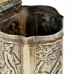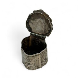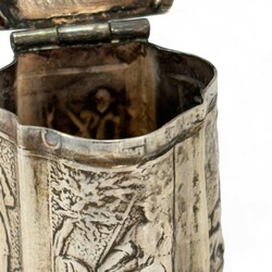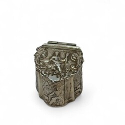 | Omschrijving | Tweede gehalte (835/1000) zilveren lodereindoosje, gecontourneerd model, met mythologisch decor op de deksel en jacht voorstellingen rondom, onduidelijk gekeurd, 18e of 19e eeuw |