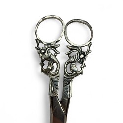 | Omschrijving | Lange schaar, mogelijk verbandschaar, met tweede gehalte zilveren ogen, elk in de vorm van een hoorn des overvloeds, onduidelijk meesterteken [met nijptang?] |