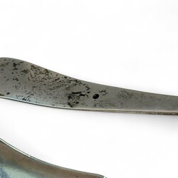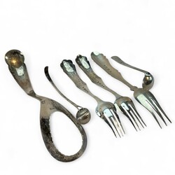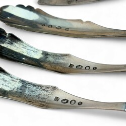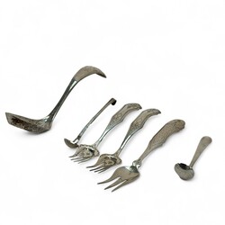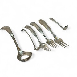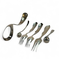 | Omschrijving | Drie tweede gehalte zilveren vleesvorken, waarvan één paar, meester Pieter Zuur, Schoonhoven, jaarletter 1879, en een eierlepel, meester Adrianus Pietersz. Kuijlenburg, Schoonhoven, jaarletter 1878, alle met verfijnde gravering in de steel en bak, daarbij: twee zilveren mosterdlepeltjes, waarvan één fijn ribdecor, meester Pieter Cool, Sneek, jaarletter 1838 |