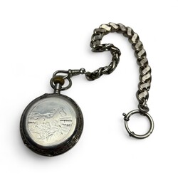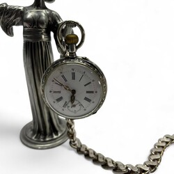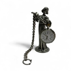 | Omschrijving | 3e gehalte zilveren zakhorloge, Frankrijk/Zwitserland, aan 3e gehalte (800/1000) zilveren horlogeketting met gegraveerde schakels, daarbij: tinnen horlogehouder in de vorm van een staande vrouw, gemerkt Achille Gamba, art nouveau-stijl, midden 20e eeuw |