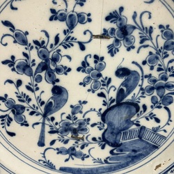 | Omschrijving | Aardewerk sierschotel met blauw-wit vogeldecor, Makkum, 18e eeuw |
