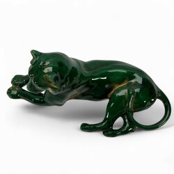 | Omschrijving | Een Frans aardewerken groen geglazuurde sculptuur van een liggende leeuw, 38 cm lang x 17 cm hoog. Gemerkt voor Saint Clément, model 8587. Ca 1930. Gaaf |