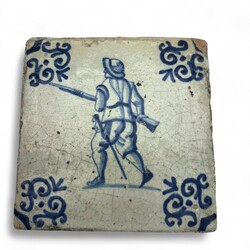 | Omschrijving | Lot van vier 17e eeuwse tegels, blauw-wit decor van soldaten, o.a. ruiter te paard en met pistool. Allen met spinnekop hoekmotief |