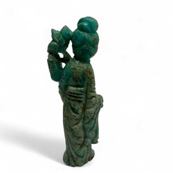 | Omschrijving | Een antiek 19e eeuws Chinees turkoois sculptuur, voorstelling van een guanyin met een bloem in haar hand. Aan de onderzijde met oud collectielabel. |