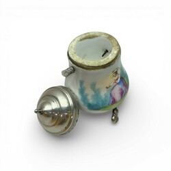 | Omschrijving | Een antiek 19e eeuws porseleinen zwavelstokkenpotje met polychroom beschilderde voorstelling, voorzien van tweede gehalte (835/1000) zilveren deksel en hengsel, op drie pootjes. |
