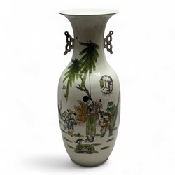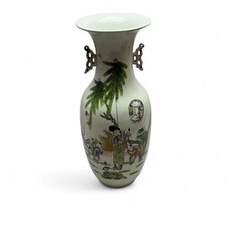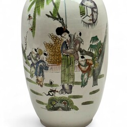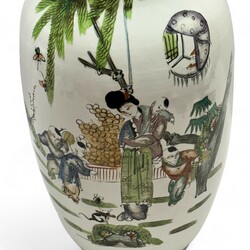 | Omschrijving | Een grote antieke 19e eeuwse Chinees porseleinen vaas. Balustervormig model met twee oren, beschilderd met decor van een vrouw met vier kinderen in een tuin, aan de achterzijde met karaktertekens. Ongemerkt. |