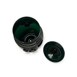 | Omschrijving | Een antieke 19e eeuwse Duitse groenglazen voorraadpot, zgn. ‘daumenglas’. Op de knop van de deksel en aan de onderzijde met pontilmerk. |